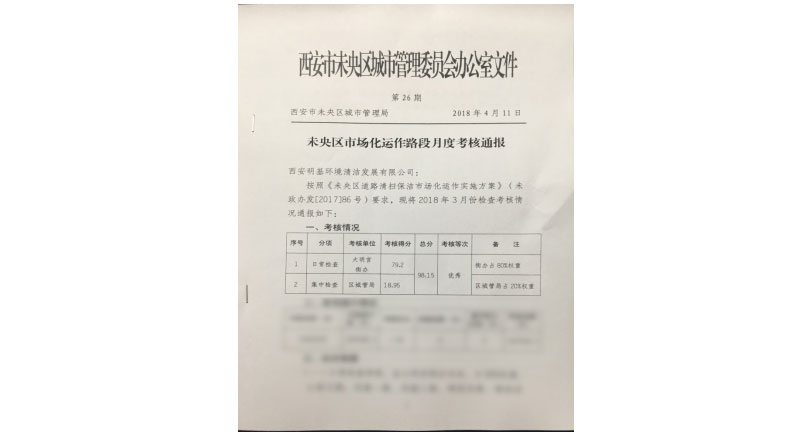 本次考核分為區(qū)、街兩級考核,日常檢查考核由大明宮街道辦負責,占比80%;集中檢查考核由未央?yún)^(qū)城管局負責,占比20%。西安明基公司在兩次考核中分別獲得79.2、18.95分,以總分98.15獲得優(yōu)秀等次,未央?yún)^(qū)各級政府對西安明基公司取得的工作成績表示祝賀,并希望西安明基公司戒躁戒糙,再接再厲,堅持問題導向,發(fā)揚企業(yè)精神,持續(xù)做好煙頭革命、以克論凈、鐵腕治霾等工作,為區(qū)市場化保潔工作提供樣板典范,為區(qū)經(jīng)濟社區(qū)發(fā)展做出應有貢獻。