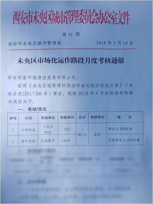 “做好一件事不難,難的是堅(jiān)持”,堅(jiān)持不懈正是對(duì)西安明基公司可貴品質(zhì)的完美寫照。繼在3月份西安市場化道路清掃保潔考核中獲得98.15高分后,西安明基公司在4月份考核中再次獲得98.14的好成績。